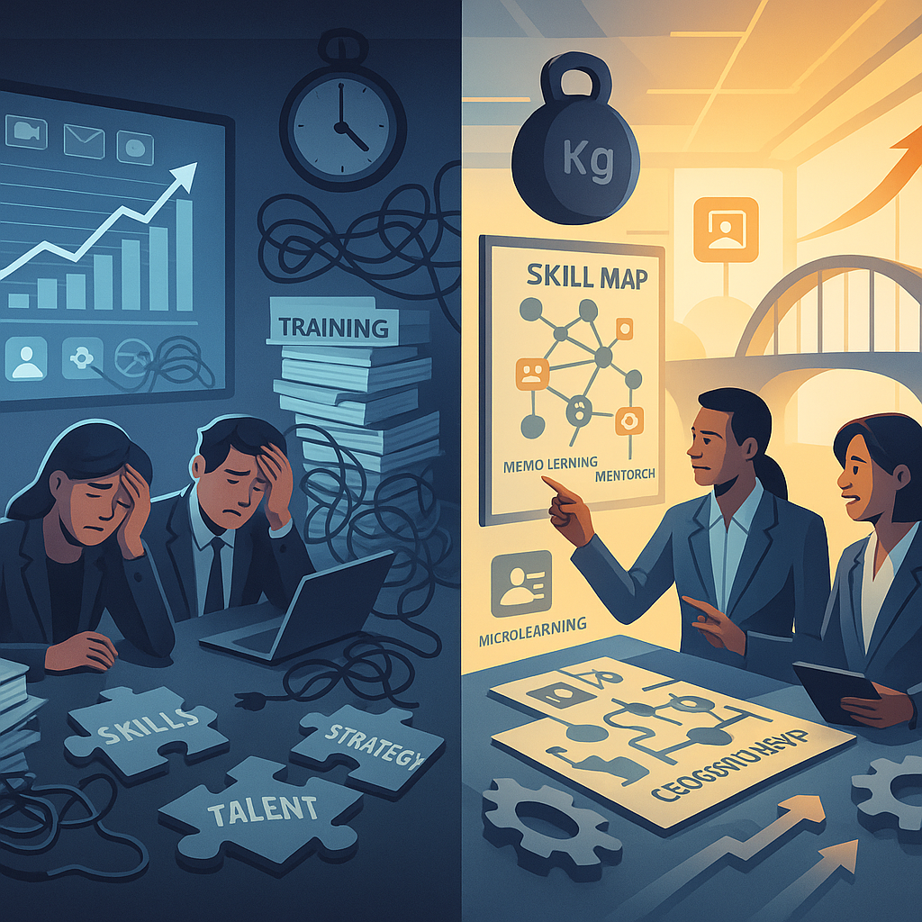 Kurumsal beceri ve yetenek açığı gerçek. Dünya Ekonomik Forumu, 2027 yılına kadar çalışanların %40’ından fazlasının teknoloji değişimleri nedeniyle yeniden beceri kazanması gerekeceğini tahmin ediyor. LinkedIn’in 2024 İşgücü Raporu, şirketlerin %59’unun nitelikli yeteneklerle pozisyonları doldurmakta zorlandığını gösteriyor. Liderler telaş içinde, çalışanlar aşırı yüklenmiş durumda. Strateji, uygulamada sürtüşmeyle karşılaşıyor.